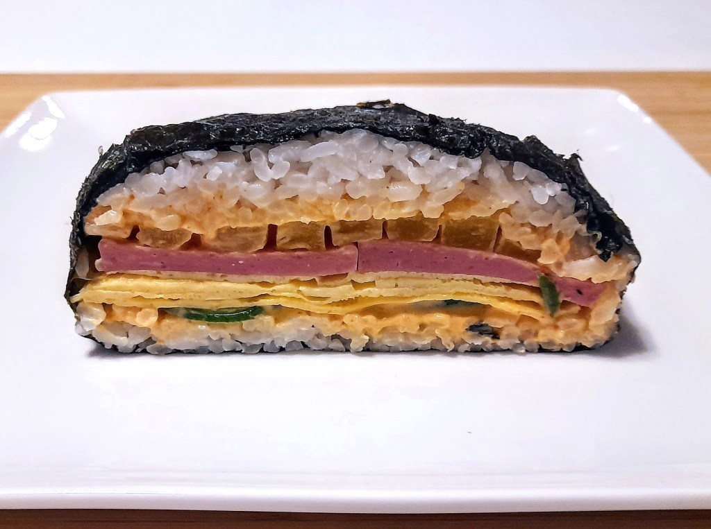 - Kimbap sandwich: sriracha mayo, 4 cucumber slices, omelette (cut to fit), spam, takuan, mayo.