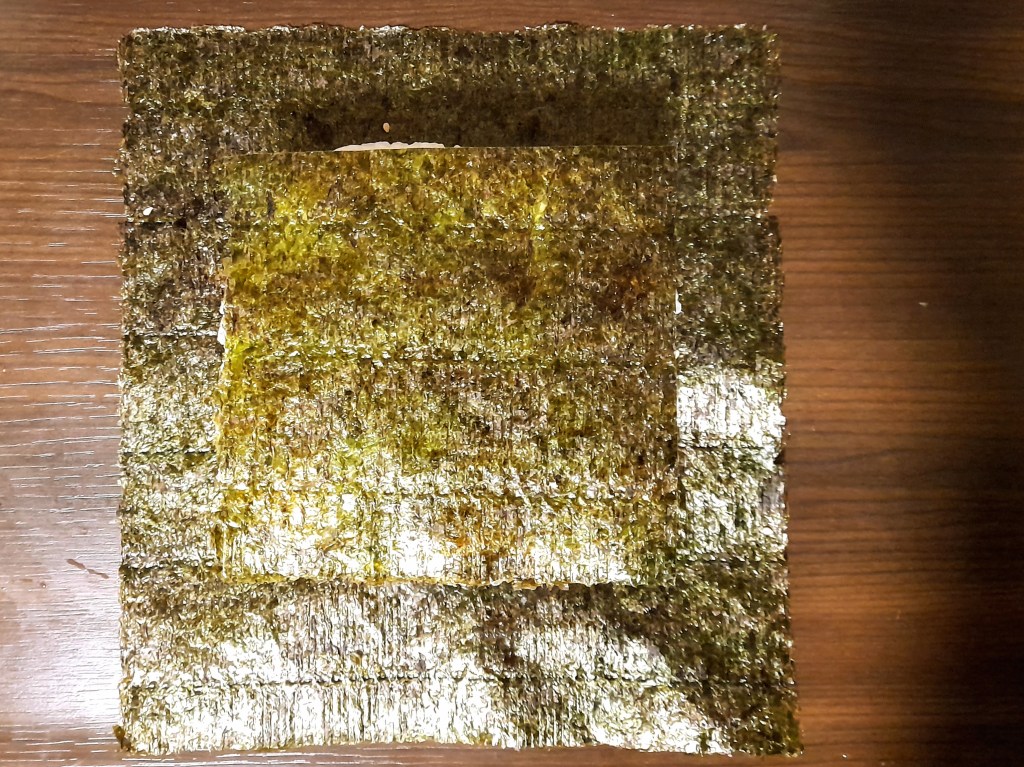 - Place the pre-cut quarter sheet of nori on top (see picture 1).