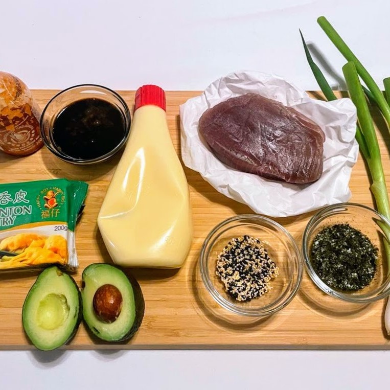 - Add toppings trying to evenly cover the dish: tuna, avocado, sesame seeds, nori, spring onion.