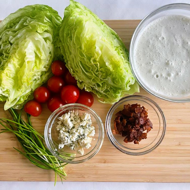 An American classic, a wedge of iceberg lettuce is covered in a tangy blue cheese dressing. Add a few toppings and you have a delicious starter, main or even side to a hearty steak or creamy buffalo mac & cheese. Remove the bacon for a vegetarian version.