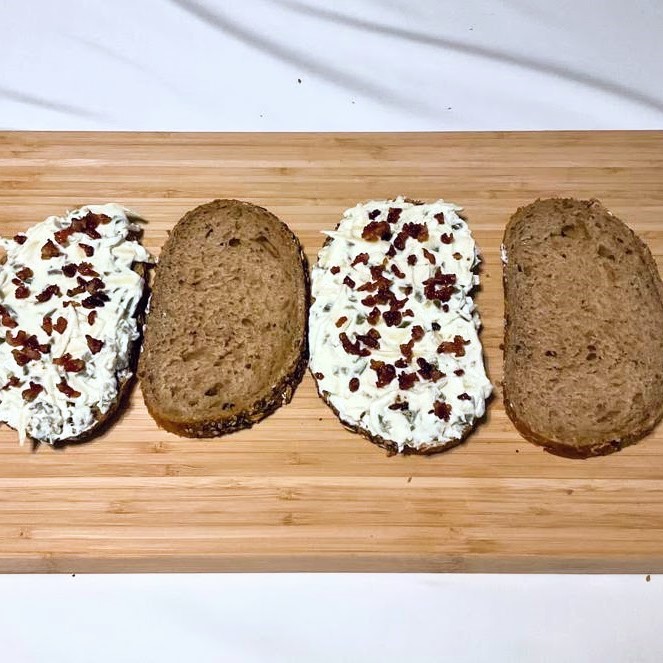 - Spread cheese mix on 2 slices of bread. Top with bacon bits and close sandwich.