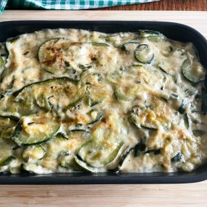Slowly caramelised courgettes in a cheesy bechamel. Great as a main dish for 2 or side for 4. 5 ingredients + seasoning.