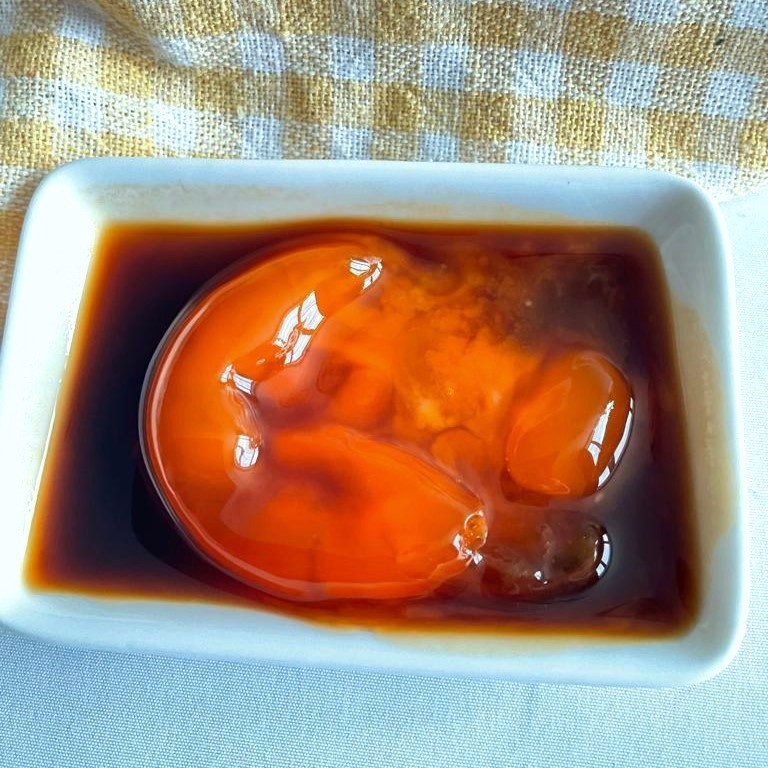 - Mix soy and mirin in a small container/ jar (ideally a small flat bottomed recipient so the yolks don’t fall to the center and squeeze against each other).