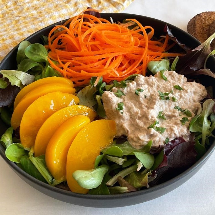This Belgian pairing may seem intriguing at first (to say the least), but the sweet peaches perfectly balance out the creamy brininess of the tuna salad. A match made in a strange heaven. Very easy recipe.