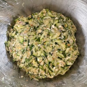 7. Form the zucchini balls: with a spoon or clean hands, grad 1 heaping tbsp of the zucchini mixture and form into a disc (picture 6).