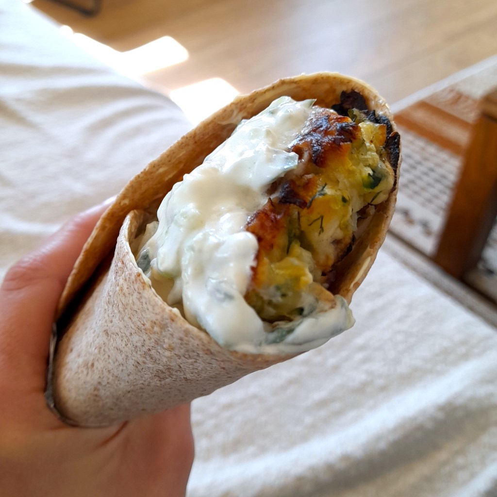 • In a pita or tortilla wrap with tzatziki and a vinegar based coleslaw (picture)