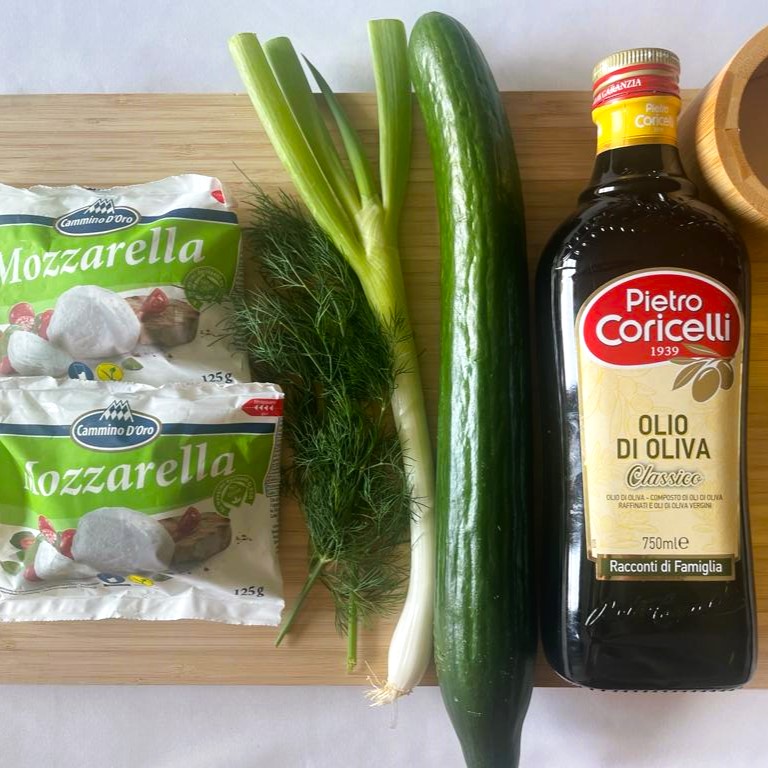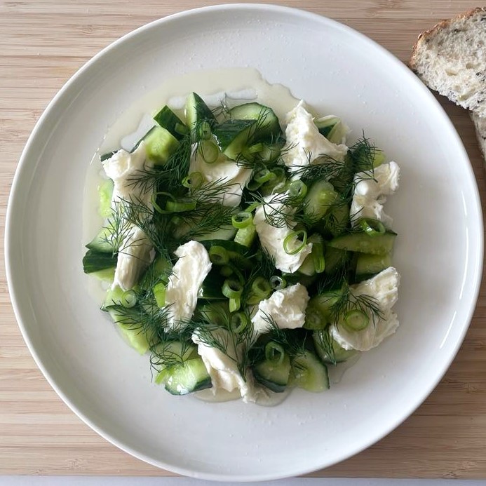 Very easy, fresh and herby. Roughly chopped cucumbers are topped with mozzarella and a generous sprinkle of dill. Great salad, to change from the classic lettuce based dishes. Serve family style or plate individually to add that je ne sais quoi.