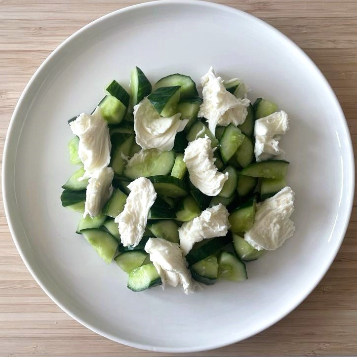- Tear the mozzarella and add to the cucumber (if plating individually use 1 ball per serve).