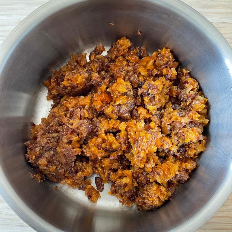 - The next day, place the soaked fruits and vinegar in a food processor and blend until roughly chopped (picture 2). If you do not have a food processor, finely chop the fruits.