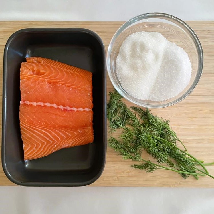 (*) Use equal amounts of salt and sugar. Salt + sugar weight should be about 1/2 of the salmon weight.