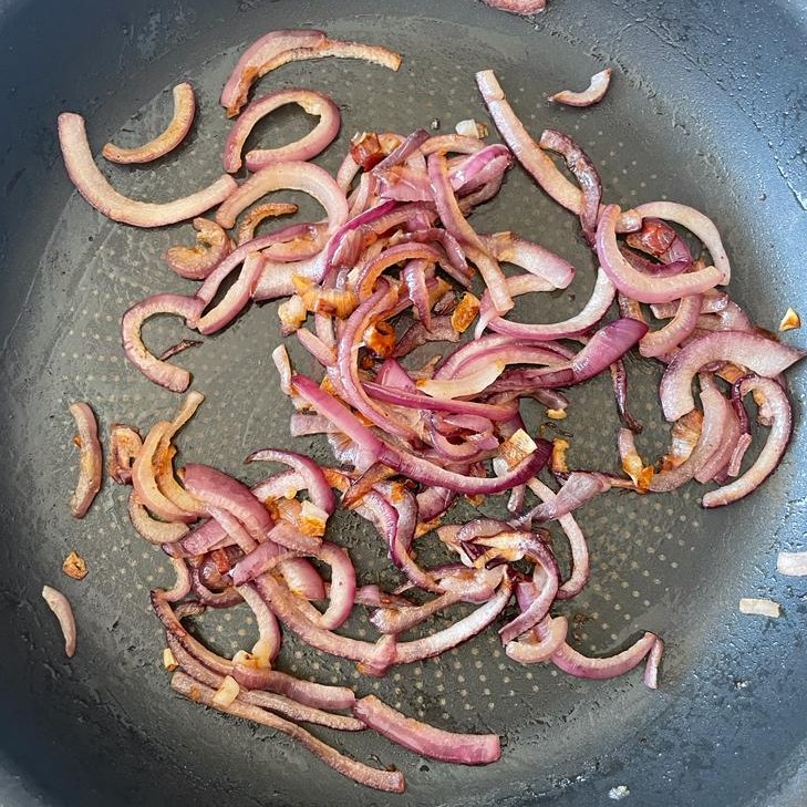 - Lower the heat to medium-low and add the sliced onion. If needed add a dash of oil.