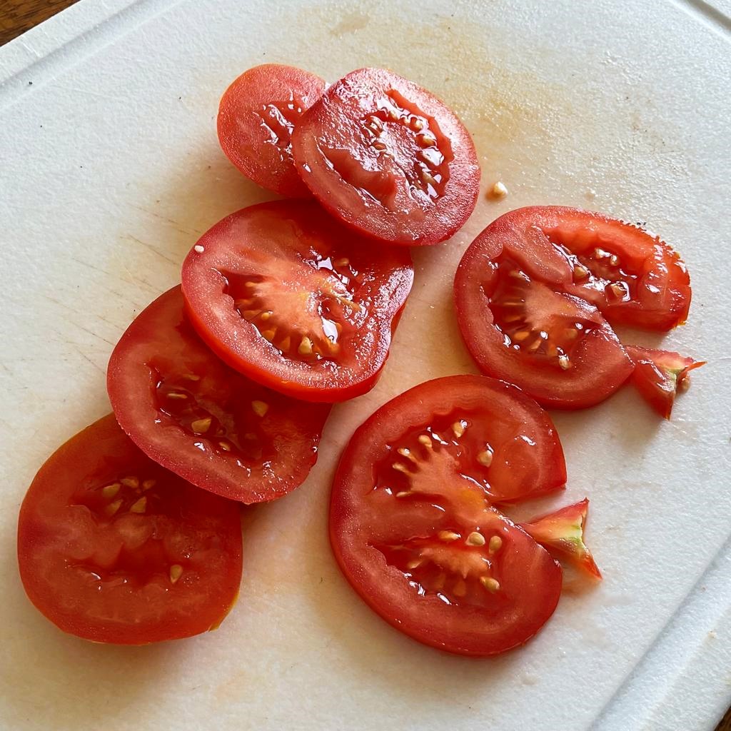 - Rinse tomato and slice into 1/2cm (1/4in) thick slices. Remove the hard core (picture 1).
