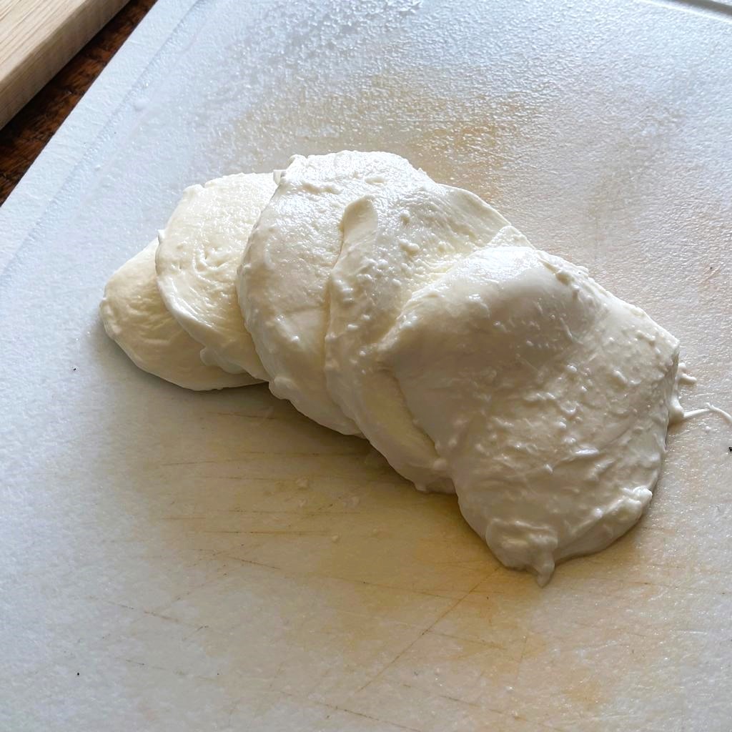 - Drain the mozzarella and slice into 1/2cm (1/4in) thick slices. I get about 5 slices from one 220g ball (~8oz) (picture 2).