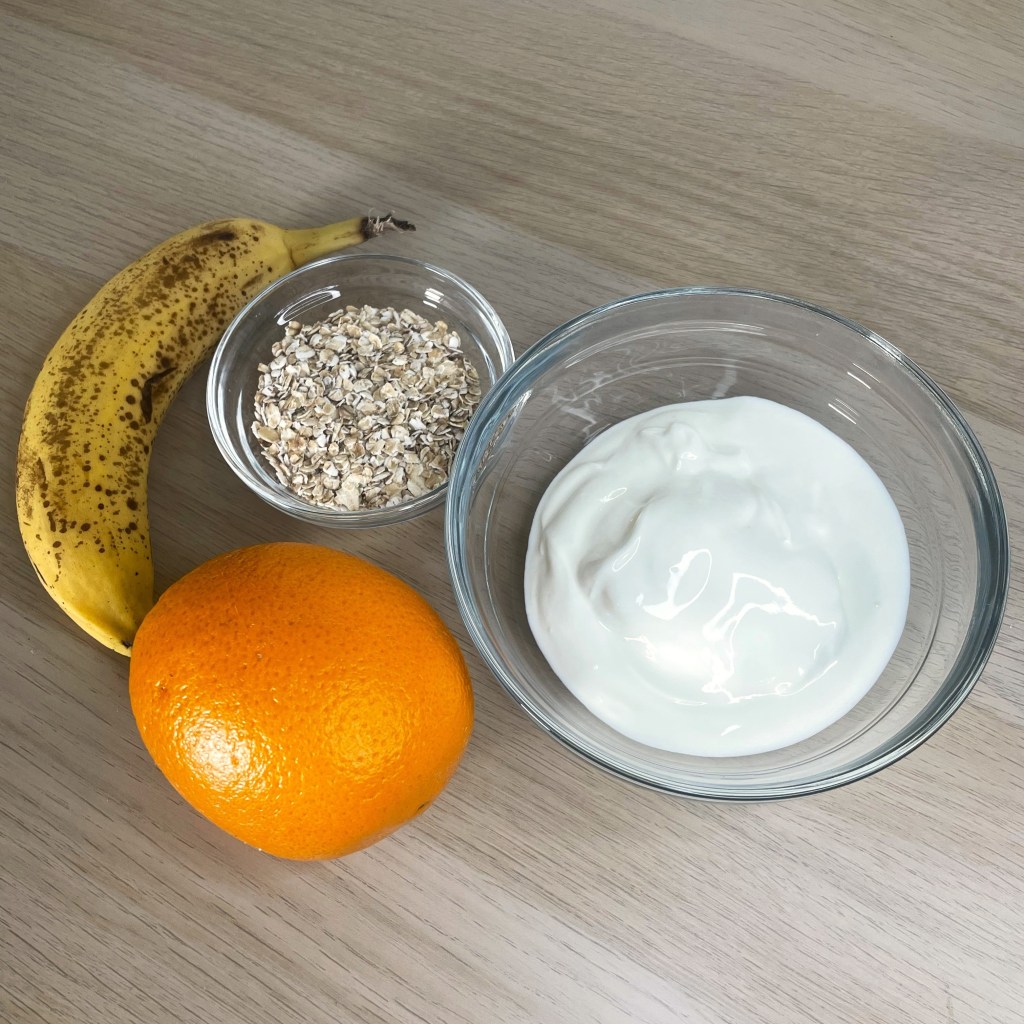 - Using a blender or hand mixer, mix together: the juice of the orange, the banana, 1/4 cup of oats and 1/2 cup of Greek yogurt. Blend.