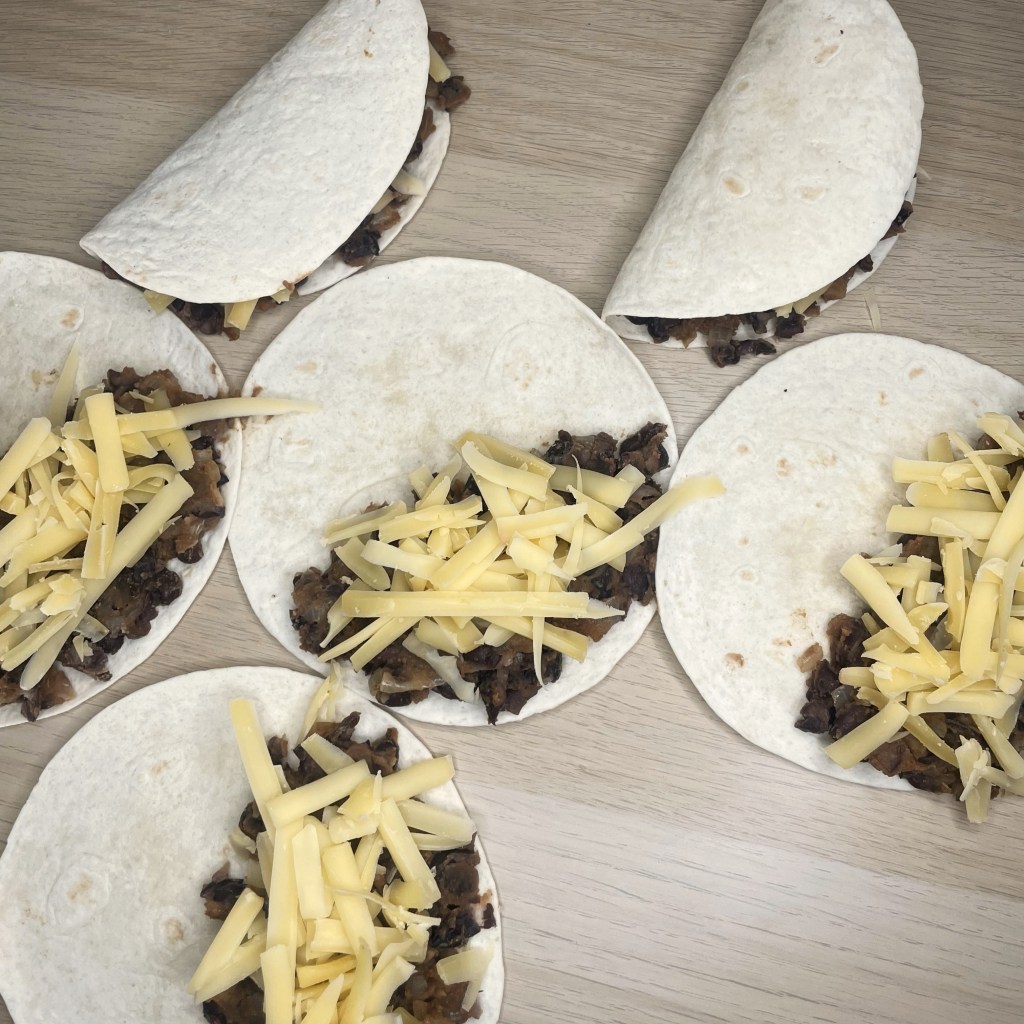 - Cover each half of the tortillas with about 1 heaping tbsp of the bean mixture and top with cheese. Distribute the beans and cheese evenly across all tortillas.