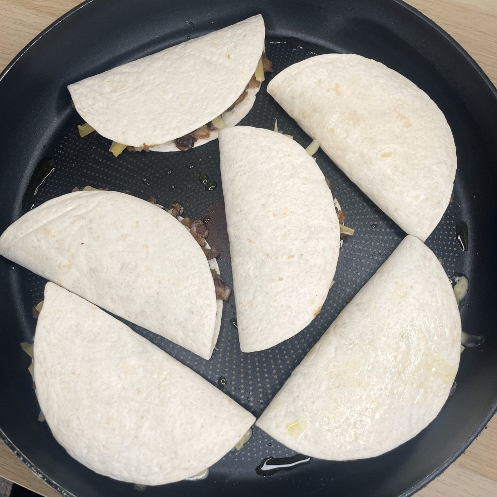 - Fold in half and pan fry on medium high heat for about 3min per side, or until golden brown.