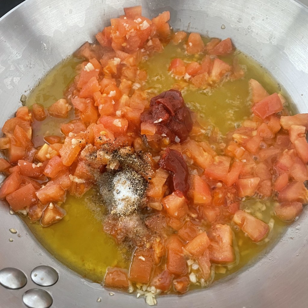 - Add 1 tbsp of tomato paste, 1/2 tsp of cumin, 1/2 tsp of salt, crushed black pepper – picture 9. If using add a pinch of cayenne pepper or chili flakes.