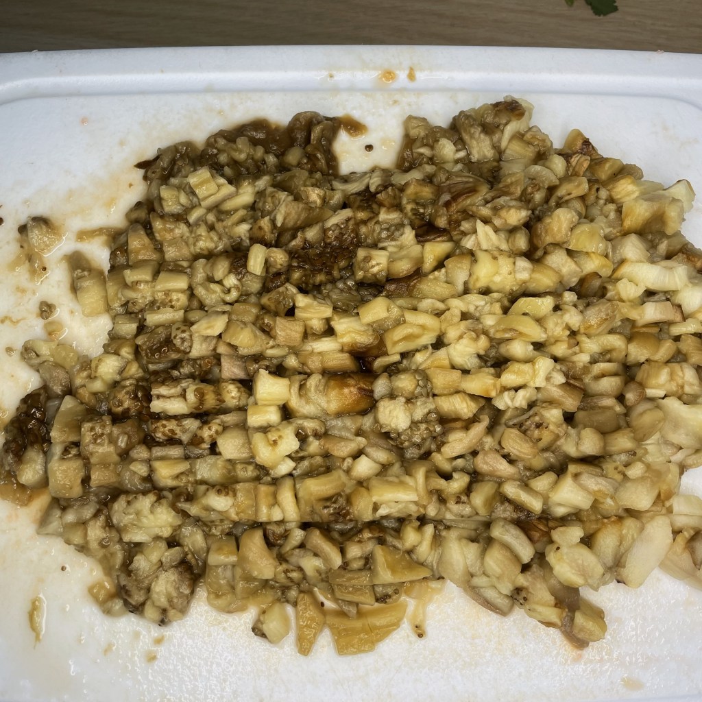 - Meanwhile peel the aubergines and chop finely – pictures 10 and 11.