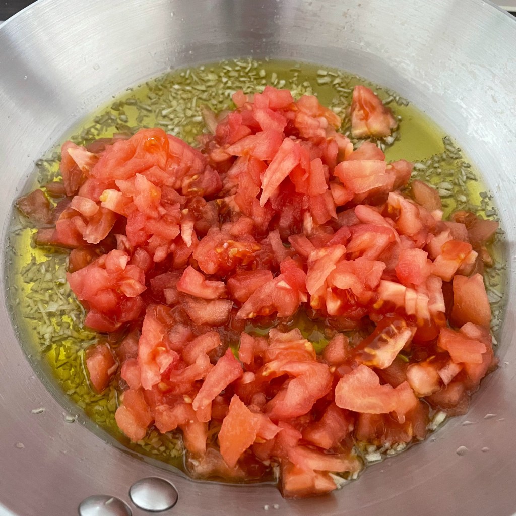 - Mince the 3 garlic cloves and chop the tomatoes.