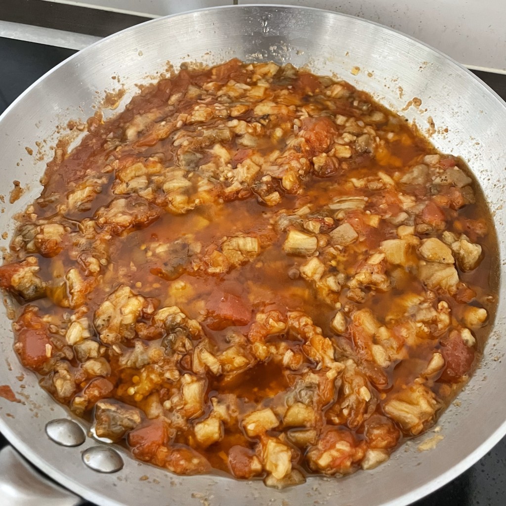 - Add the aubergine to the pan along with the 2 tbsp of olive oil (optional – used in picture recipe). Mix well and cook uncovered for 15min, stirring occasionally – pictures 12 and 13. Crush with the back of the spatula or spoon.
