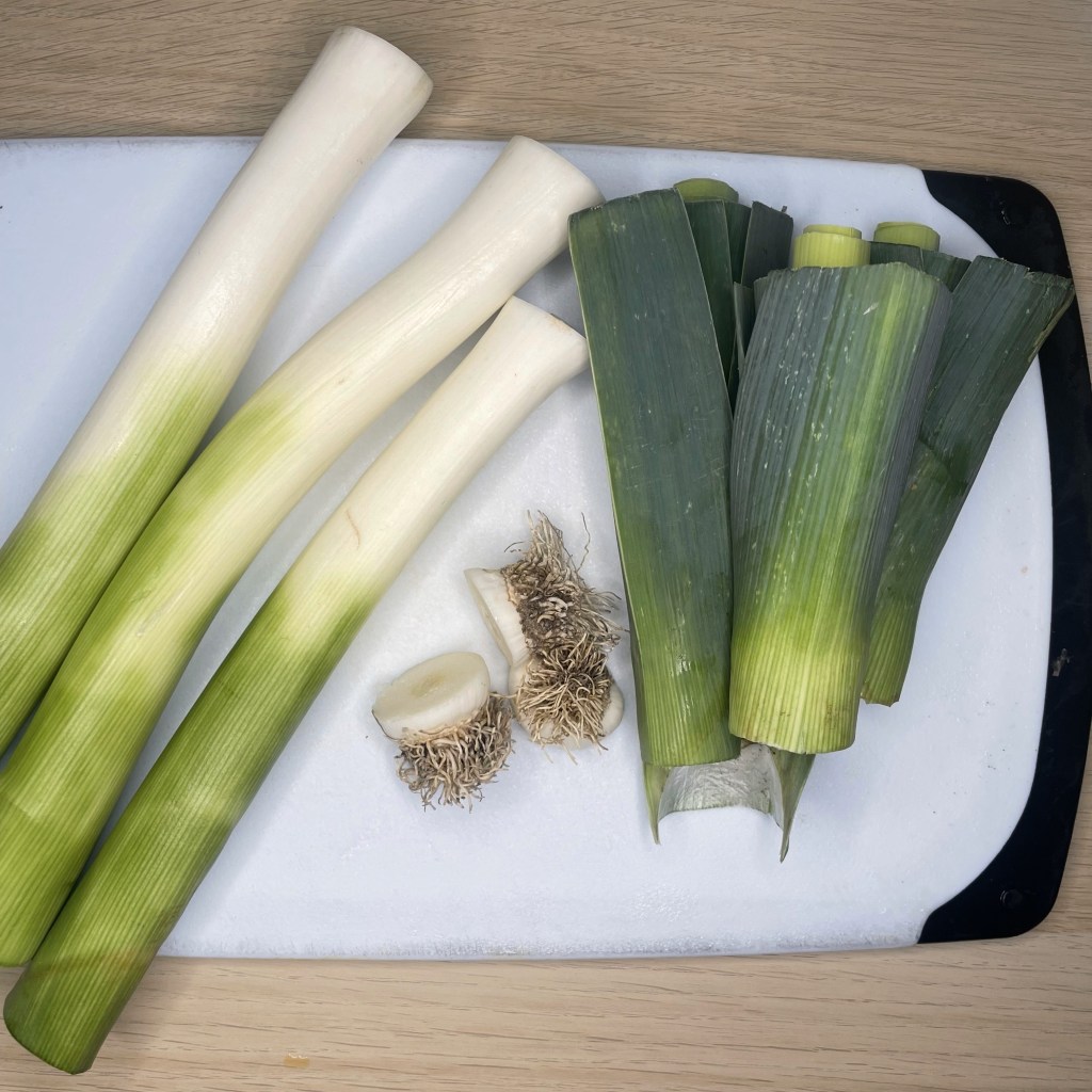 - Cut off the base and dark green part of the 3 leeks – picture 1. Discard.