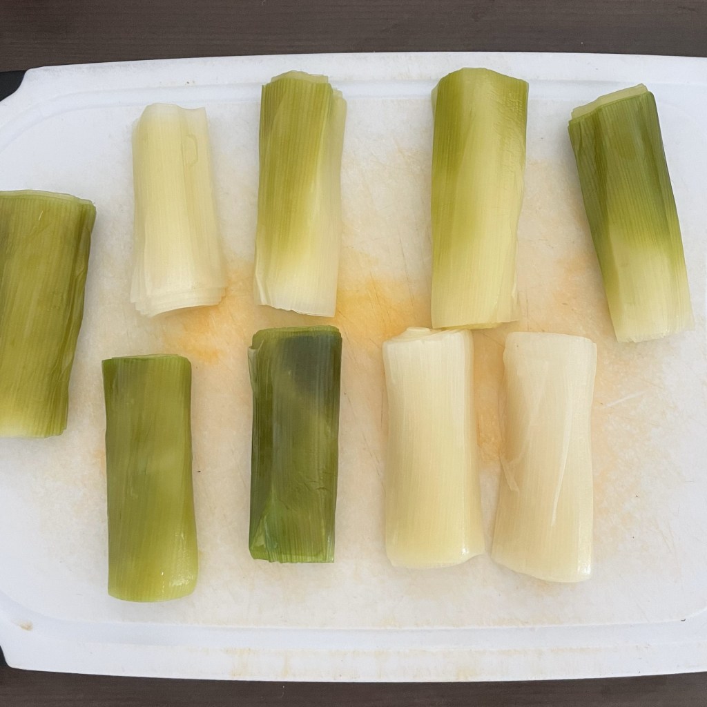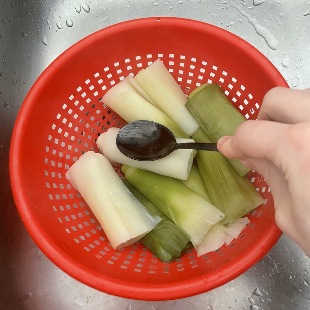 - The leeks are ready once soft (you can test with a toothpick), drain them – picture 9. Gently press excess water out of the leeks. You can do that with the back of a spoon – picture 10, or by running them under cold tap water to cool them and gently pressing with your hands (be careful it could be hot) – picture 11.