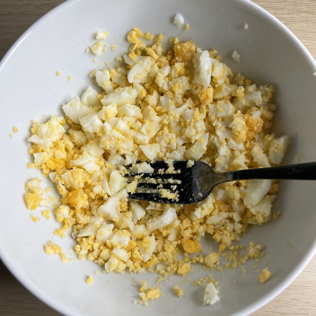 - Once the eggs are done, run under cold water and peel. Mash the eggs with the back of a fork – picture 8.
