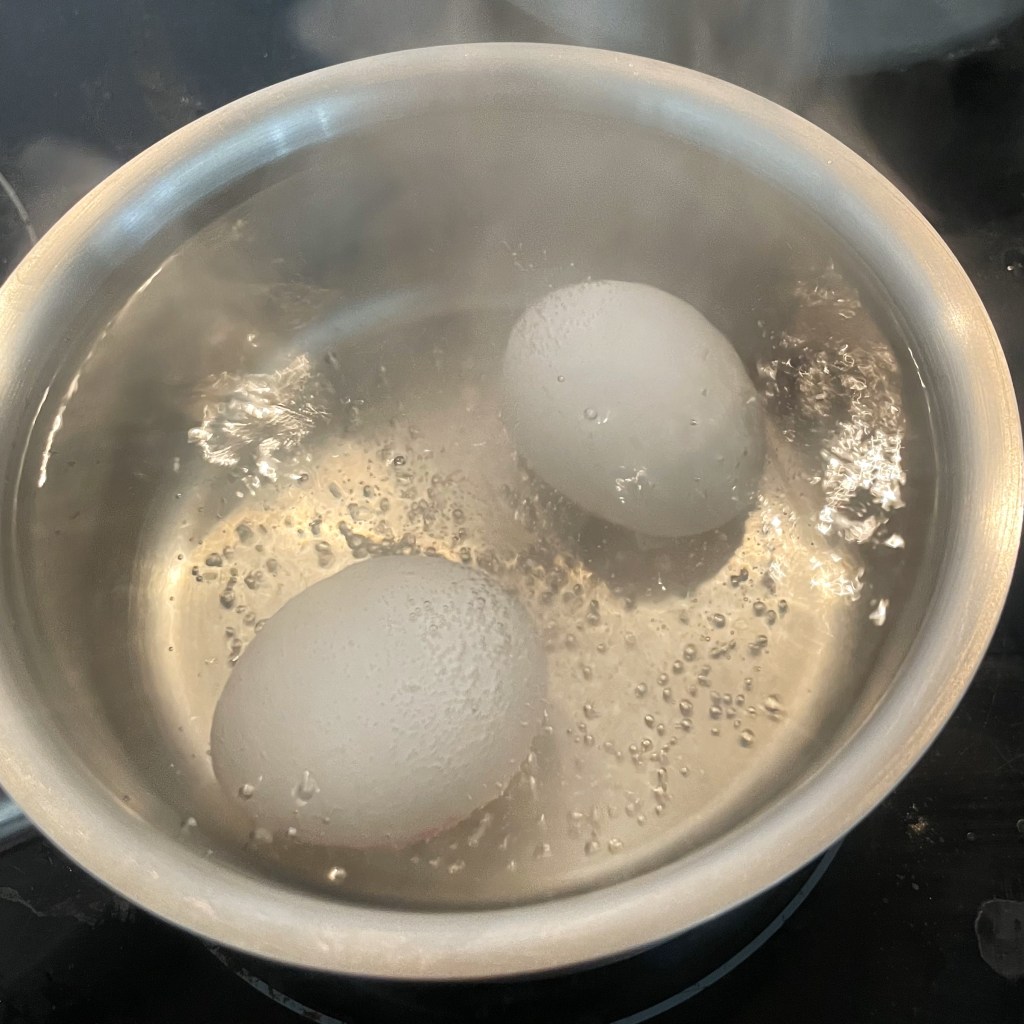 - Meanwhile, place the 2 eggs in the small pot of boiling water – picture 5. Cook for 10 min.
