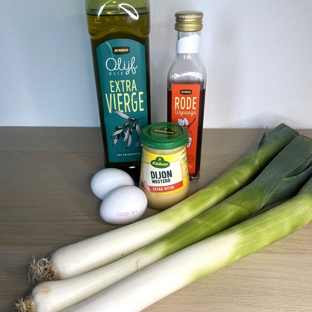 - Dress the leeks in the vinaigrette. To serve top with the crumbled eggs.